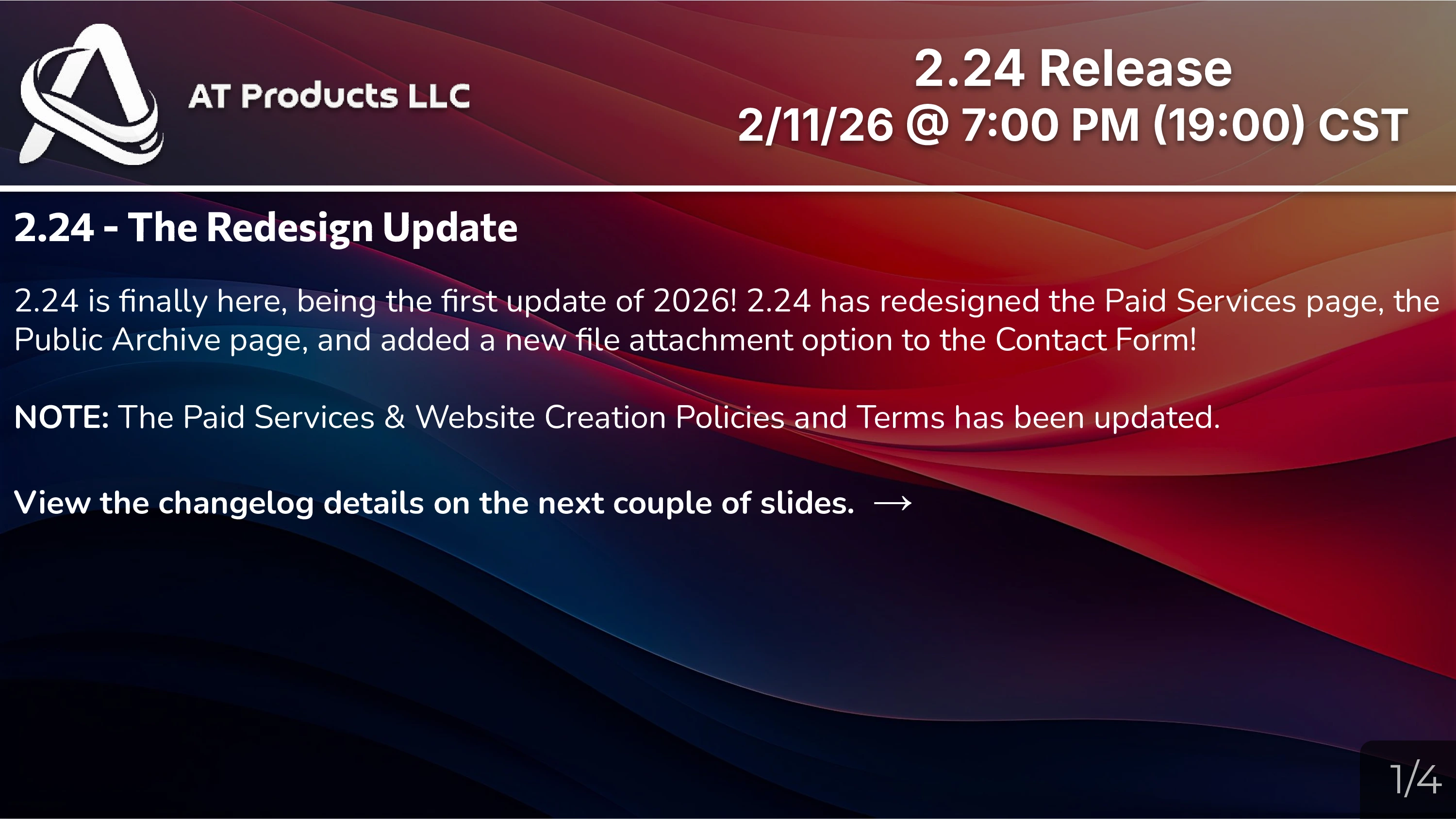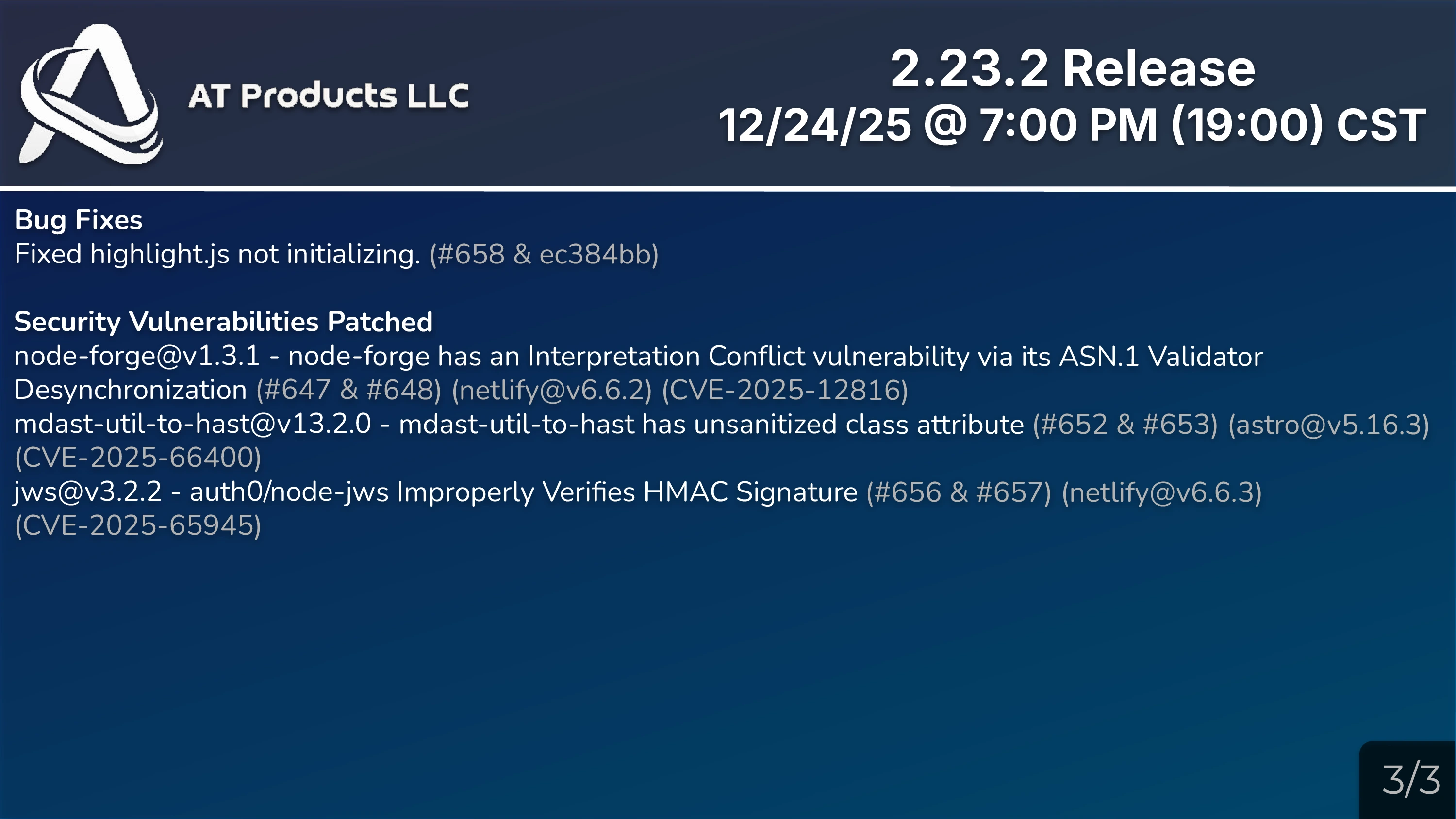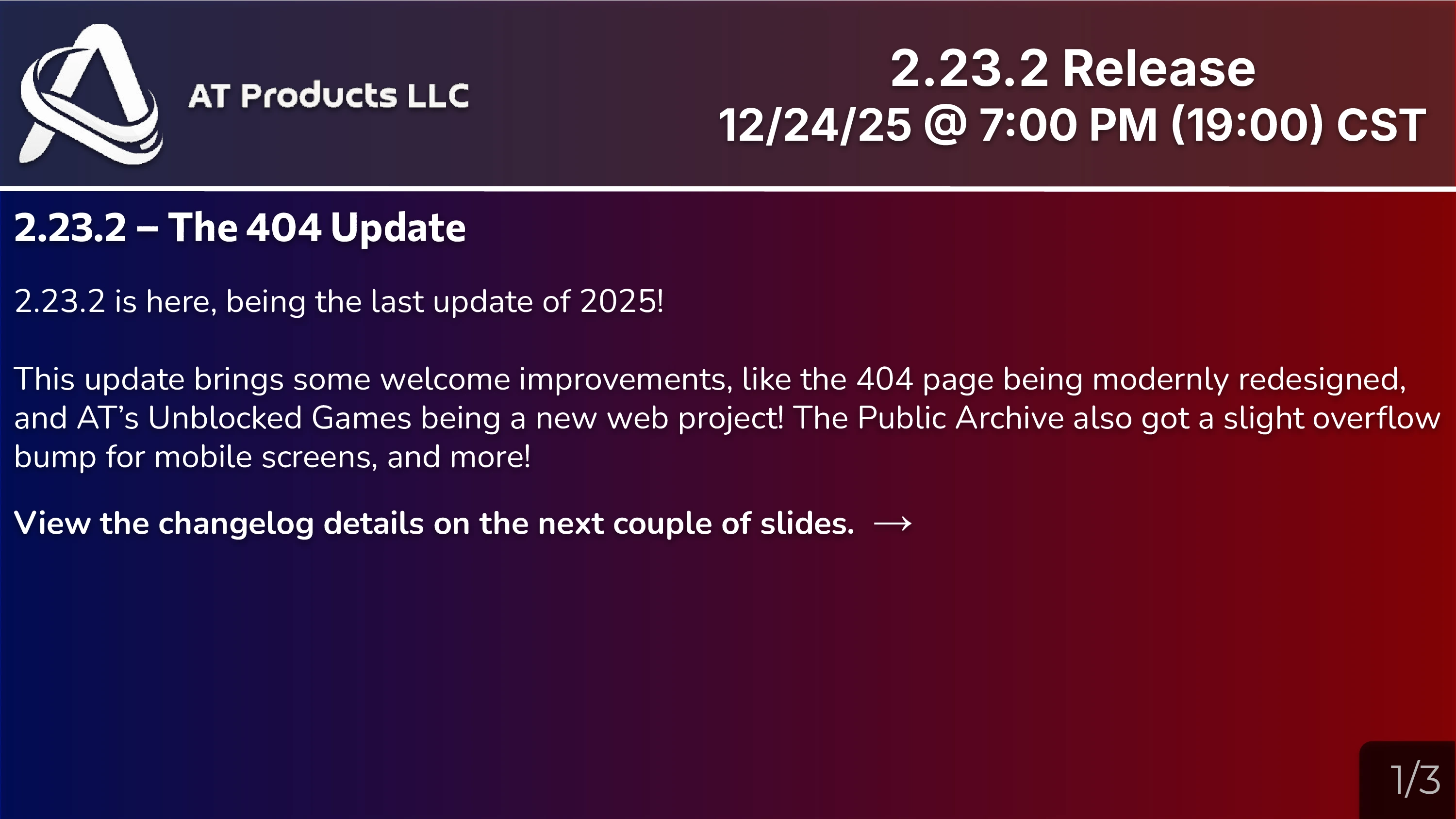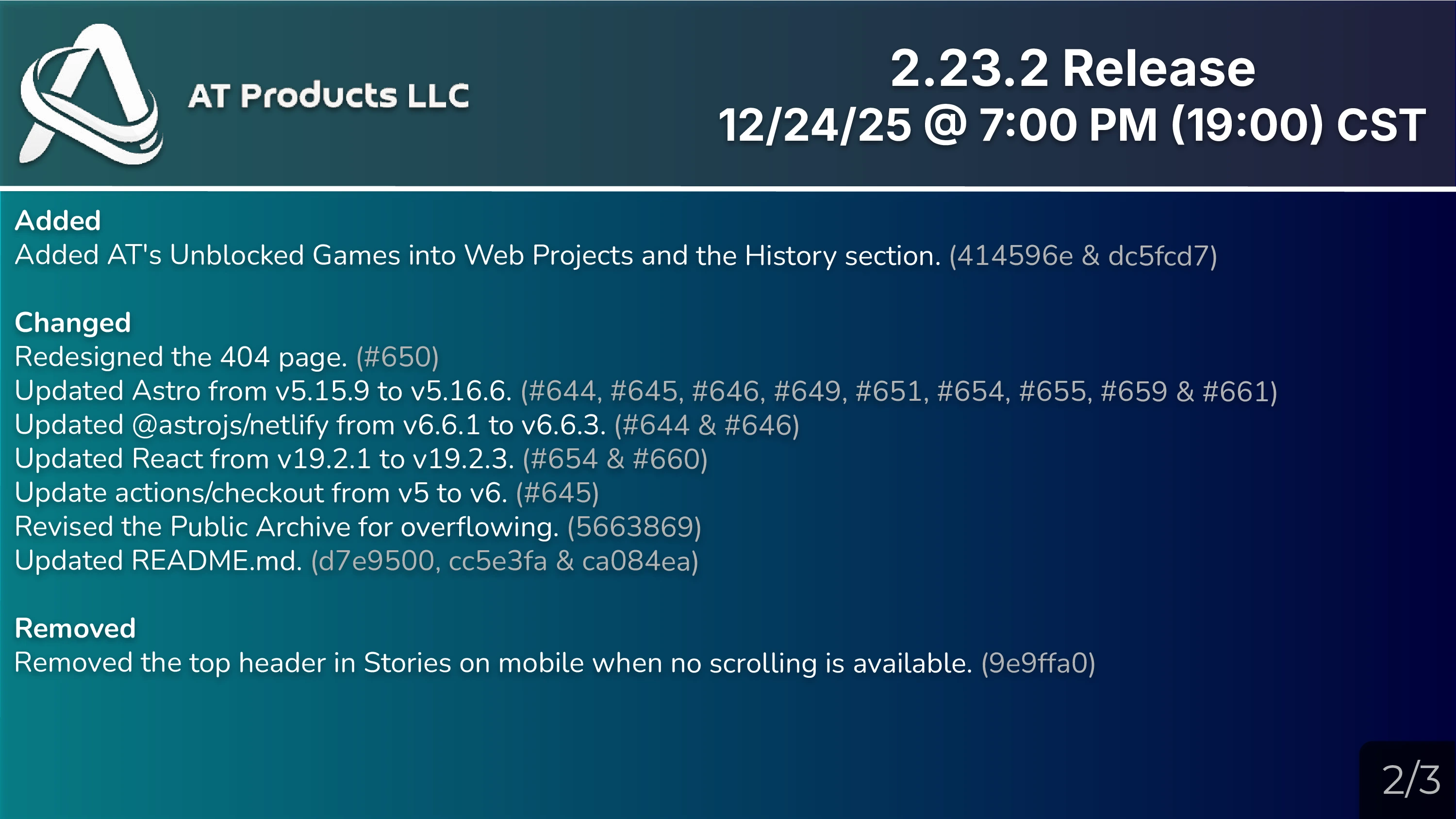 The first update of 2025, 2.21, released on February 12th, replaced modals from 2022 (from 2.8) back into their own page/articles (from the code.org days) from all Community/Product pages that contained them. The index page got redesigned in March with 2.22, which also introduced code blocks. The latest update, 2.23, released on September 3rd, introduced several new features and improvements. This includes the addition of Mine Falls as a product, enhancements to MDickie Projects, the inclusion of icons in code blocks, an overhauled mobile navbar design, and the introduction of the RadiumOS page as part of Pynx Projects. On November 26th, AT's Unblocked Games released! The project features 90+ unblocked, unique games with absolute user control.