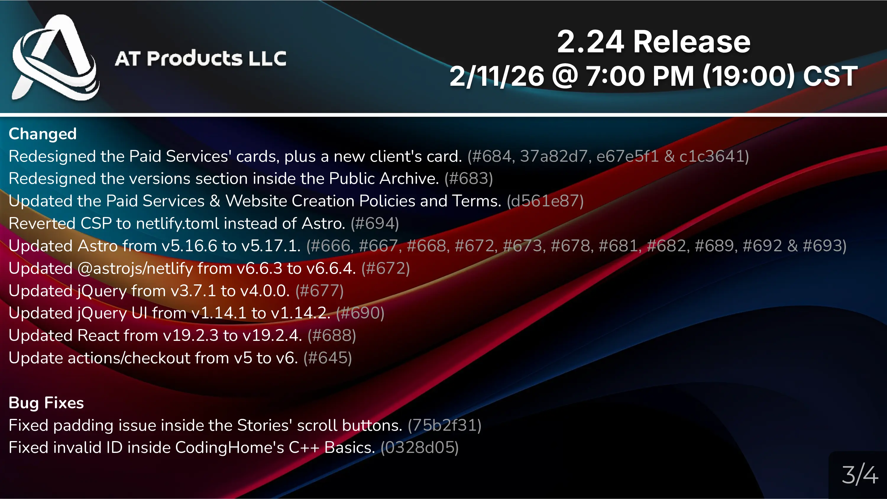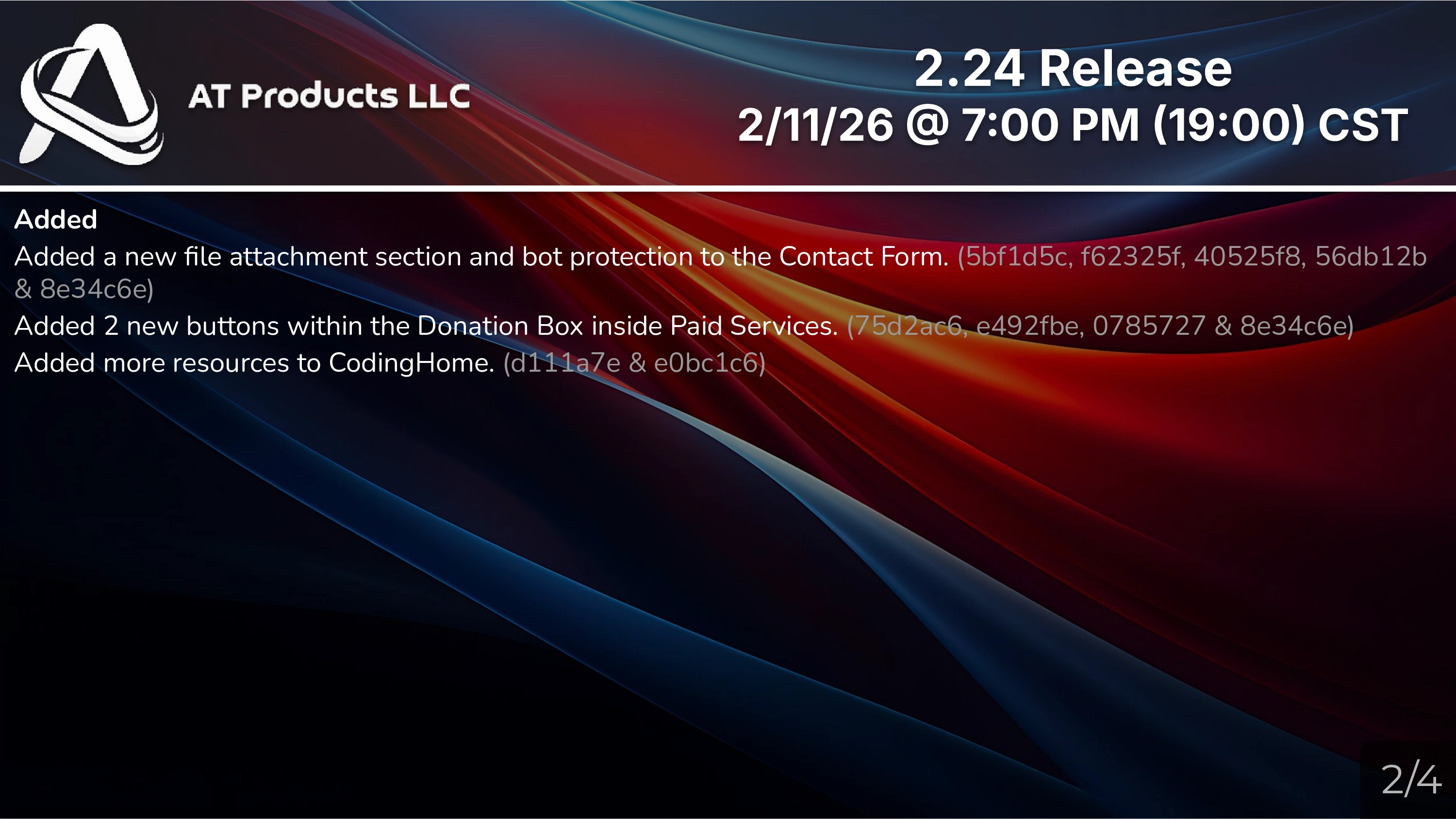 The New Year of 2022, brought CodingHome, and our Documentation. Finally, we bought the domain atproducts.org in February and put the same code there. But, soon enough, ProtDos permitted us to use their (and our) past CSS, which was Bootstrap 3. We changed the CSS to make it dark a month later, sold the domain a month later, and bought the atproducts.xyz domain... a month later. and then changed it back in June. Between March and June, we introduced Flash Documentation and the Noodle Hackerspace as new products. The hugest overhaul would happen on June 3rd, with 2.6. Which replaced Bootstrap 3 with Bootstrap 5. Not much later, on August 21st, we changed the company logo in 2.6.1, to a more professional design. 2.7, released on September 22nd, changed the nav bar. In late August, AT Products joined and helped create The CodingHome Universe (now the International Developer's Association), a coders alliance with our current allies. 2.8, released on October 9th, 2022, added modals for each section within Community/Product page (which would be replaced in 2025 with 2.21).